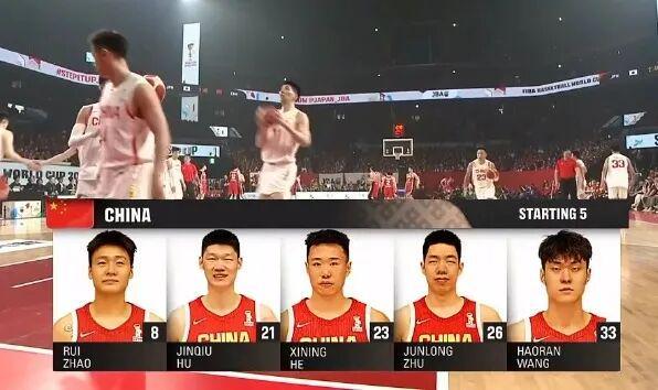 中国男篮首发:赵睿、胡金秋、贺希宁、朱俊龙、王浩然。